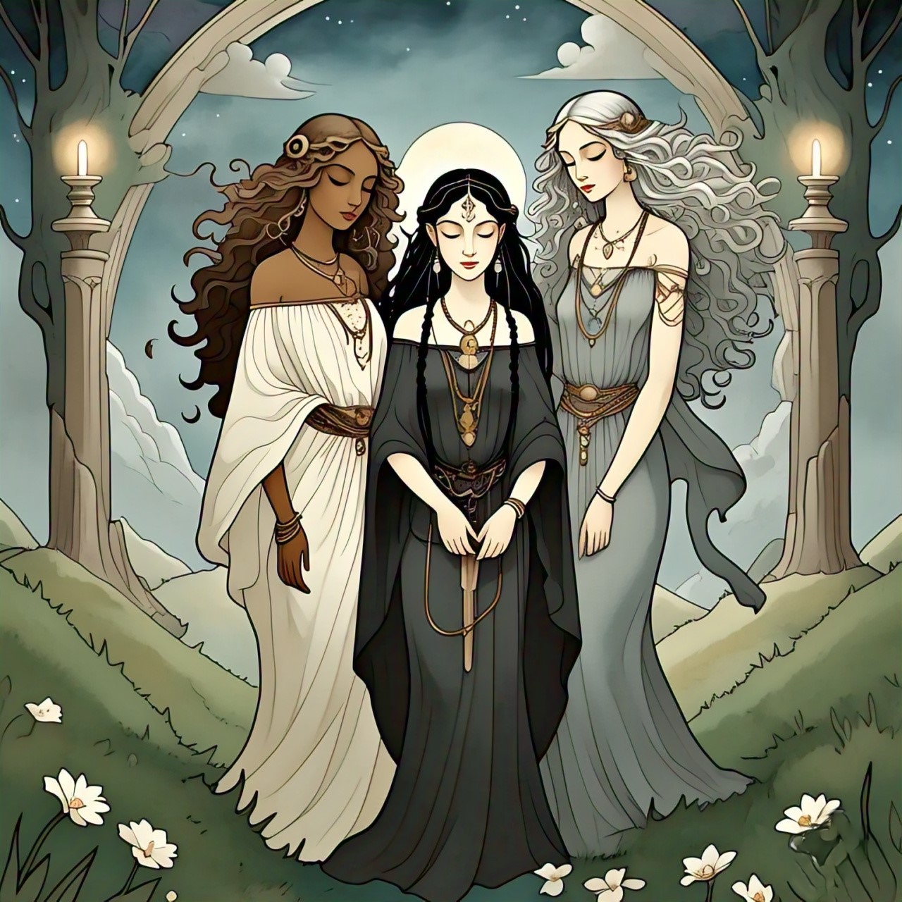 The sacred feminine trinity representing the cyclical nature of life – Maiden, Mother, and Crone – each phase holding unique wisdom and power.