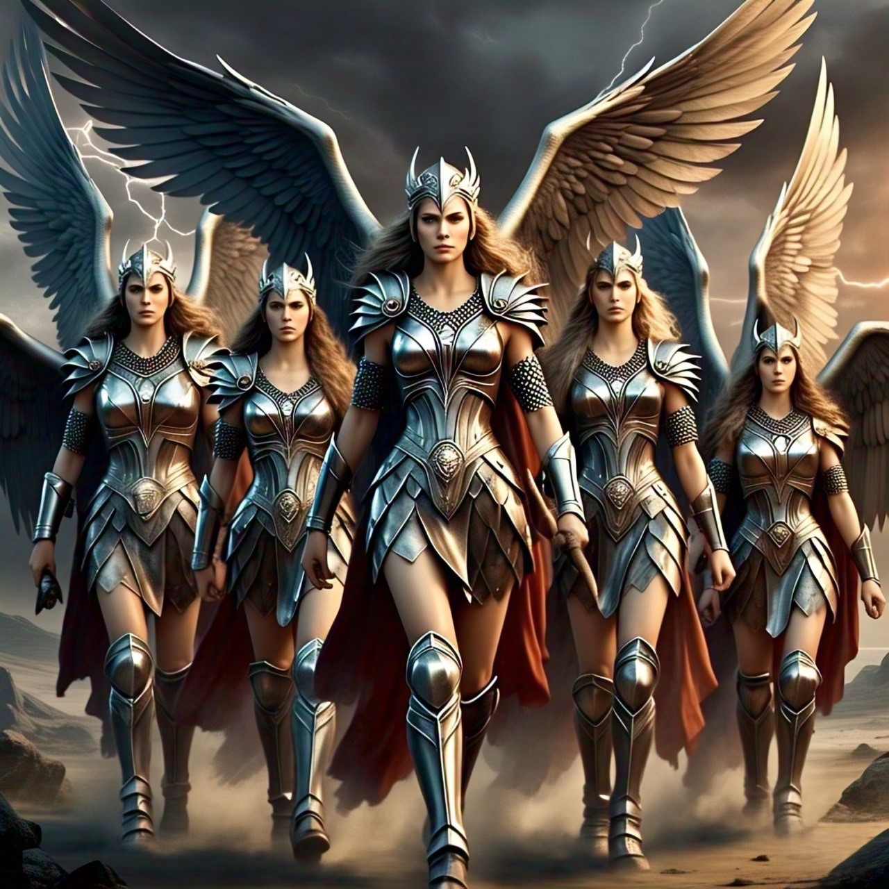 Celestial warrior maidens who choose the most heroic fallen warriors to join Odin in Valhalla, symbolizing divine selection and honor.
